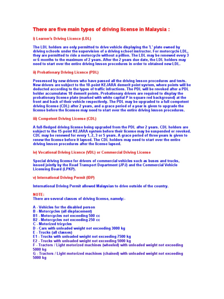 In this case, you would only sit for one theory exam (albeit with a bigger number of questions) and save time and money in registration fees. Obviously having an international driving permit allows one to drive outside of malaysia. Different driver's licenses can be used to operate different classes of vehicles. Every driver's license in malaysia comes with an expiry date and it is your responsibility to renew it on time to avoid any complications down the road. Identification and accountability for better road safety.